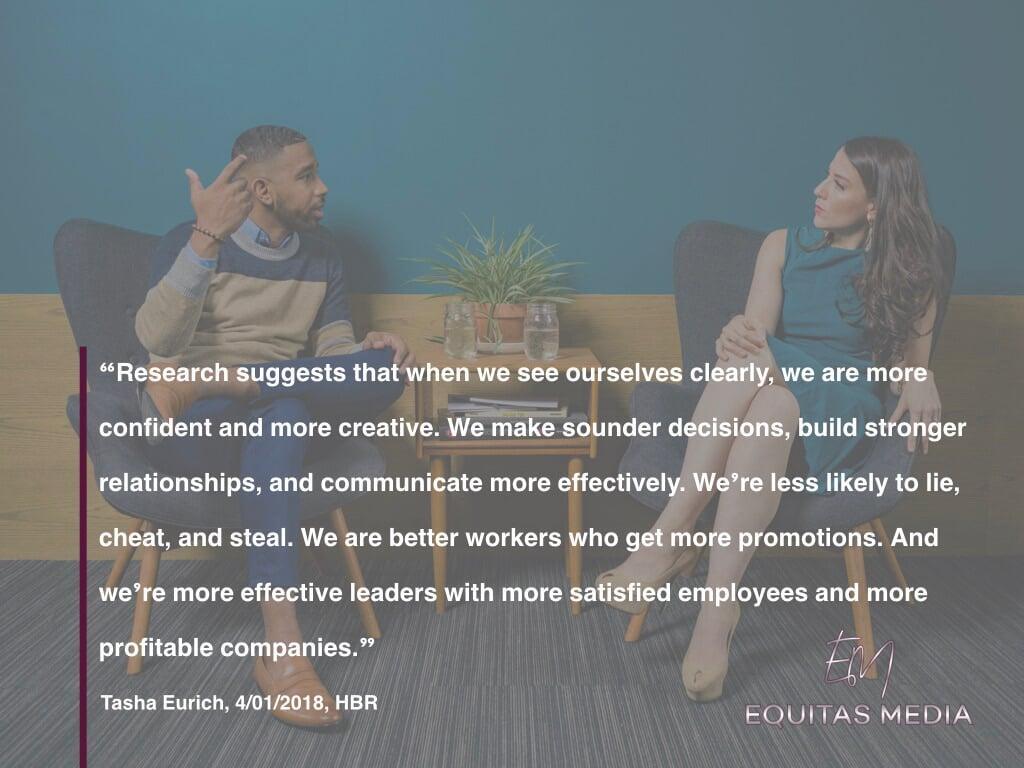 Tasha Eurich and her research team have identified two kinds of self awareness: internal self-awareness (how well you know yourself) and external self-awareness (how well you understand how others see you). Now to the benefits. The benefits the research team lists includes: